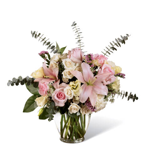 Featuring stunning blushing pink exotic lilies as the centerpiece, this bouquet is surrounded by creamy lisianthus, delicate fronds of Queen Anne's lace, pink carnations, white and pink roses, and fresh forest greens. Each flower symbolizes a different aspect of her personality, from her beauty and poise to her humility and dignified stature.
